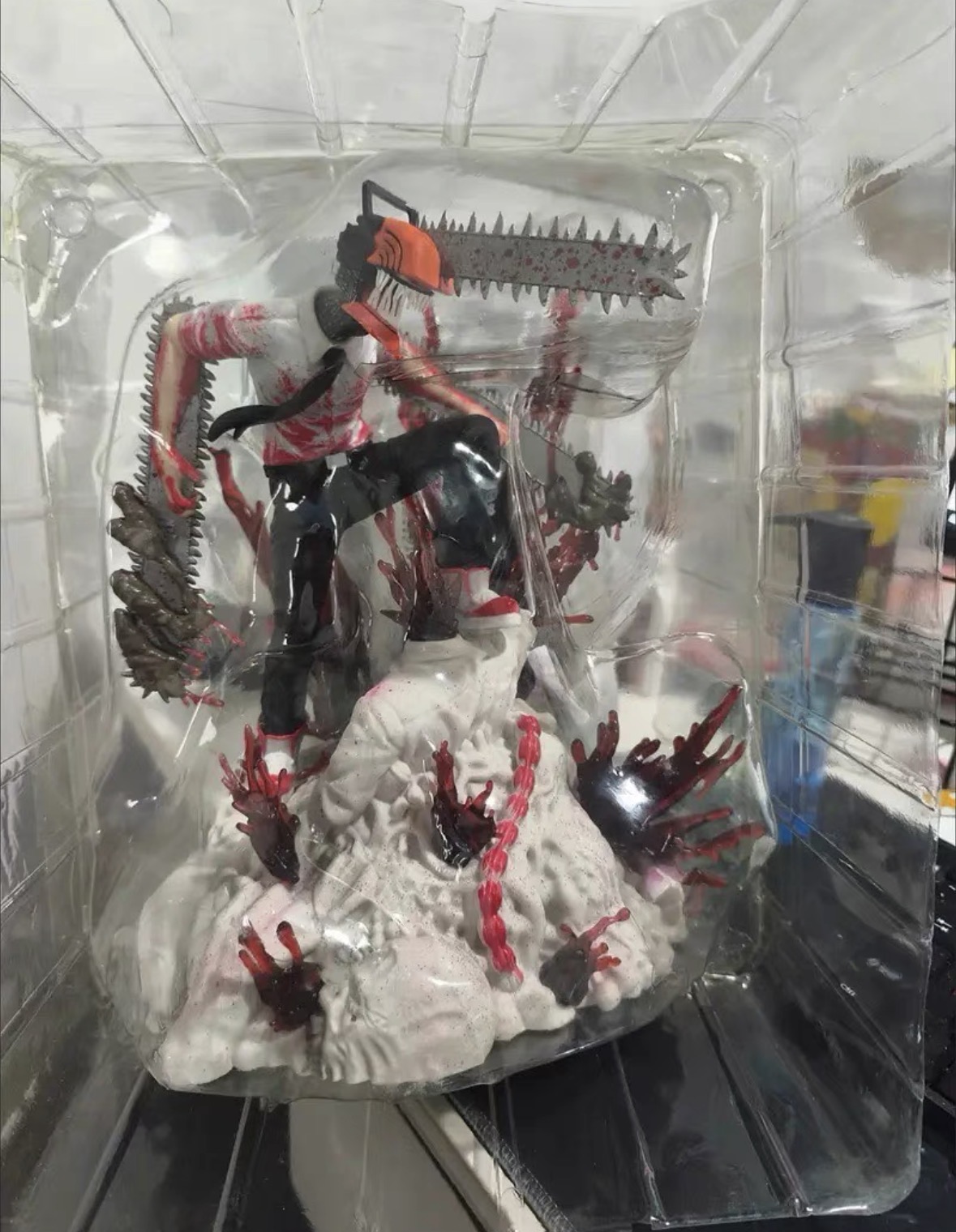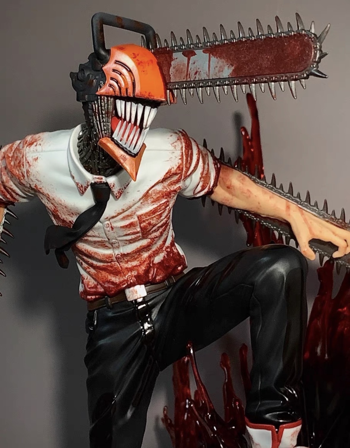 4. What can be observed about the paint quality and material finishes on this Chainsaw Man statue?