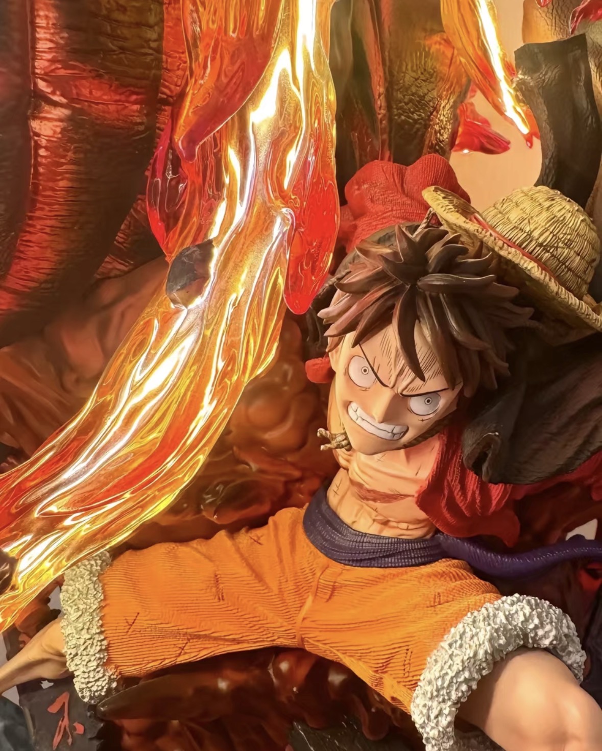 The figure exhibits exceptional sculpting detail, especially evident in Luffy's musculature, determined facial expression, and the intricate, translucent fiery aura. The paint finish appears clean, vibrant, and precise, with effective shading and clear separation of colors, indicating high craftsmanship.