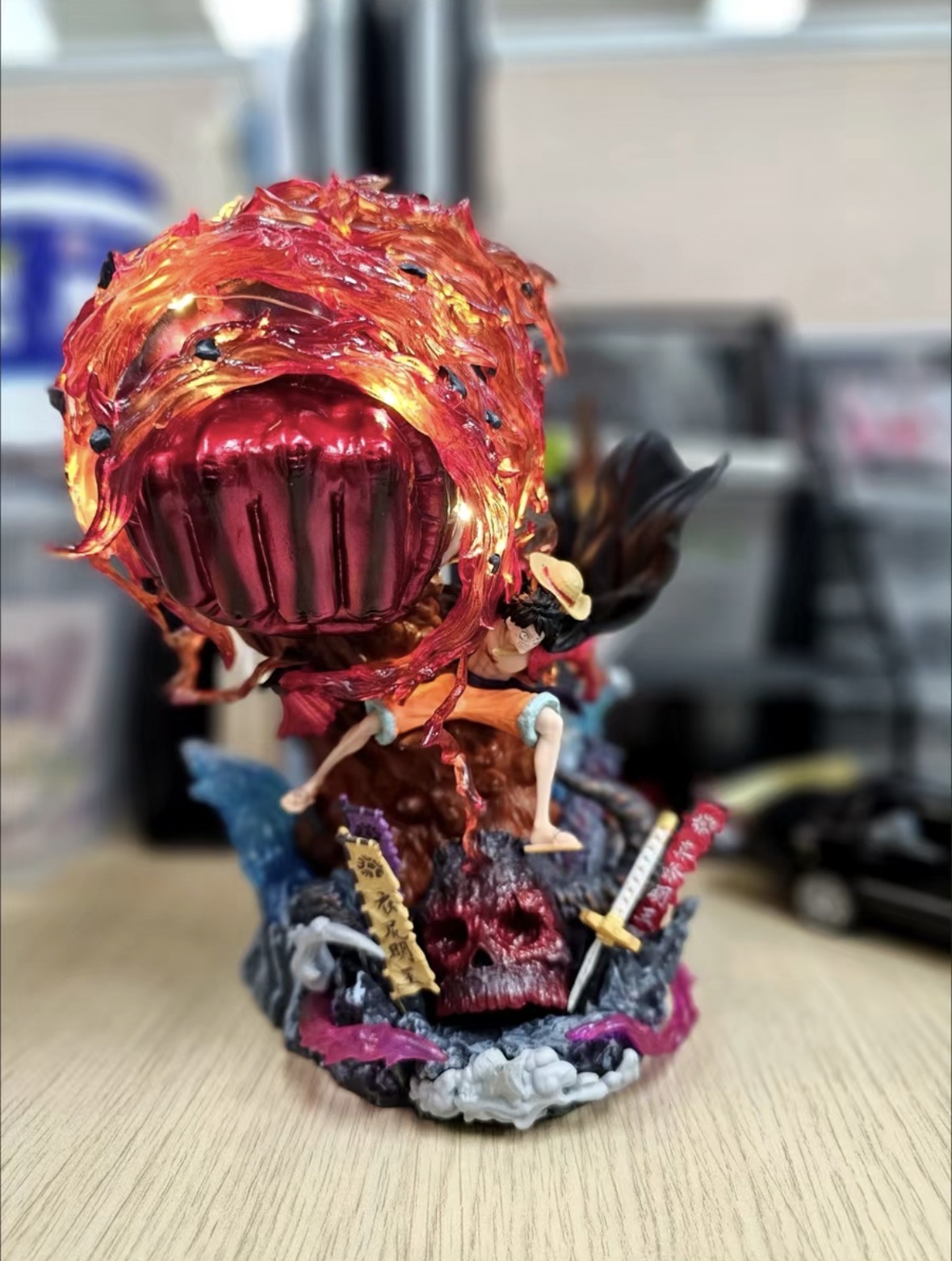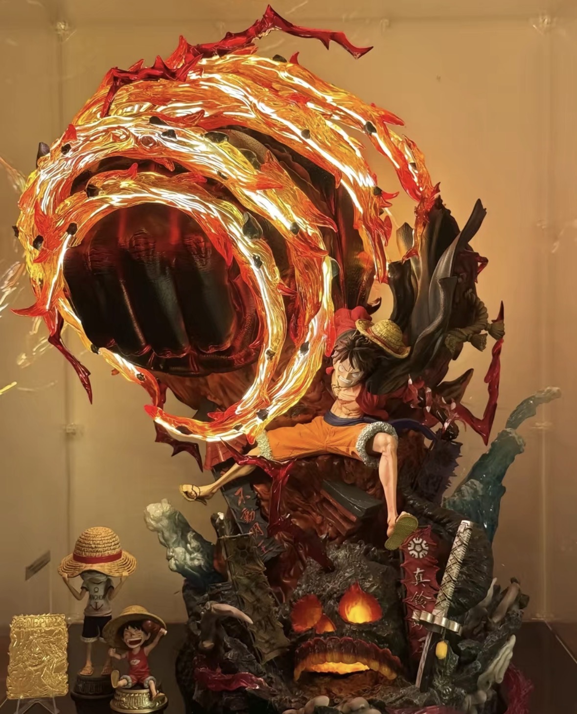 Yes, the image clearly shows the massive, swirling fiery orange and red aura around Luffy's right fist is brightly illuminated. It emits a vibrant glow, suggesting integrated lighting, which significantly enhances the dynamic visual impact of the figure.
